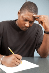A man expressing anxiety while taking a test.