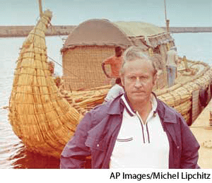 1. Norwegian ethnologist and explorer who led the Kon Tiki expedition (1947) on a raft across the Pacific Ocean from Peru to Tuamotu to demonstrate that Polynesians may be of South American origin. In 1970 he crossed the Atlantic Ocean from Morocco to Barbados in a papyrus boat to show that ancient Egyptians might have sailed to America.海尔达尔,托尔:(1914-2002) 挪威民族学家、探险家,曾于1947年发起探险乘坐木筏康·提基号从秘鲁出发横渡太平洋到达土木土,以证明波利尼西亚人或许来自南美洲。1970年他乘一艘纸莎草船从摩洛哥出发横渡大西洋到达巴巴多斯,以表明古代埃及人可能曾乘船到过美洲