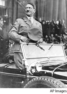 1. Austrian-born founder of the German Nazi Party and chancellor of the Third Reich (1933-1945). His fascist philosophy, embodied inMein Kampf (1925-1927), attracted widespread support, and after 1934 he ruled as an absolute dictator. Hitler's pursuit of aggressive nationalist policies resulted in the invasion of Poland (1939) and the subsequent outbreak of World War II. His regime was infamous for the extermination of millions of people, especially European Jews. He committed suicide when the collapse of the Third Reich was imminent (1945). 希特勒,阿道夫:(1889-1945) 奥地利裔德国纳粹党的创始人,曾任第三帝国(1933-1945年)的总理,他的法西斯哲学主要体现在《我的奋斗》 (1925-1927年)一书中,并得到广大的支持,1934后成为全权独裁者。他执行的侵略性民族主义国家政策,造成了对波兰的入侵和随后的第二次世界大战的爆发,他因对尤其是欧洲犹太人等数百万人口的灭绝政策而臭名昭彰,并于第三帝国即将崩溃时(1945年)自杀