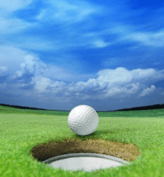 A golf ball about to fall into a hole.