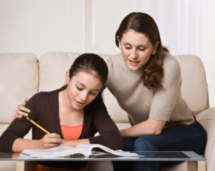 A woman helps her daughter with her homework.