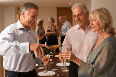 A couple recieve a drink from their host.