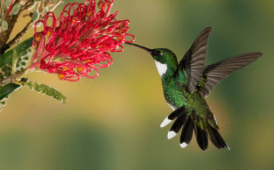 A hummingbird hovers near a flower.