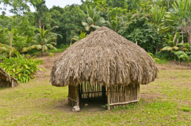 A thatched hut in the jungle.