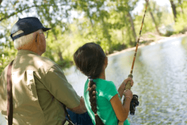 A grandfather imparts his knowledge of fishing to his granddaughter.