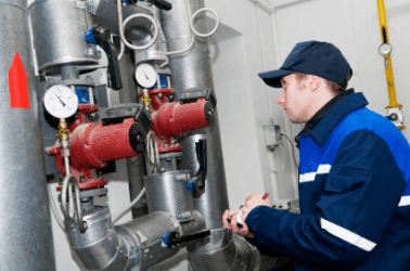 A heating inspector checks a boiler.