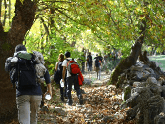 A group of people on a journey throught the rainforest.