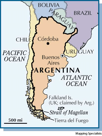 Ar·gen·ti·na AHD[är'jən-tēʹnə] abbr.缩写 Arg.D.J.[ˌɑːdʒənˈtiːnə]K.K.[ˌɑrdʒənˈtinə]NONE(无词性) Argentina- A country of southeast South America stretching about 3,701 km (2,300 mi) from its border with Bolivia to southern Tierra del Fuego, an island it shares with Chile. Argentina is one of the most highly developed Latin American countries, with an economy based both on agriculture and on diversified industry. It proclaimed its independence from Spain in 1816. Buenos Aires is the capital and the largest city. Population, 27,947,446.阿根廷:南美洲东南的一个国家,从它与玻利维亚的边界,到与智利共有的岛屿火地岛,大约3,701公里(2,300英里)。阿根廷是拉丁美洲最高度发达的国家之一,经济基于农业及多样化工业。它于1816年宣布脱离西班牙而独立。布宜诺斯艾利斯是其首都及最大城市。人口27,947,446