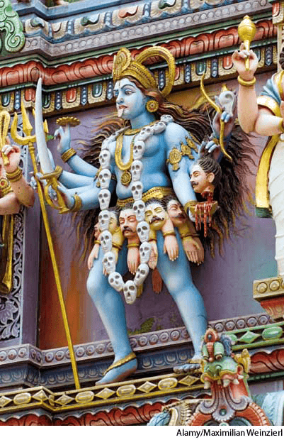 1. One of the manifestations and cult titles of the wife of Shiva and mother goddess Devi, especially in her malevolent role as a goddess of death and destruction, depicted as black, red-eyed, blood-stained, and wearing a necklace of skulls.时母:湿婆神(大自在天)的妻子及村庄女神所宣称及崇拜的神祇名称之一,尤其是她身为死亡及破坏女神邪恶的角色,被描绘成皮肤漆黑,红眼,沾满血渍并挂着骷髅头项链的样子